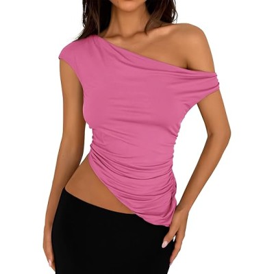 Womens 2024 Summer Off The Shoulder Crop Tops Sleeveless One Shoulder Ruched Asymmetrical Going Out Tank Top