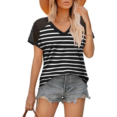 Tops for Women V Neck T-Shirts Swiss Dot Short Sleeve Shirts Casual Fashion Blouses