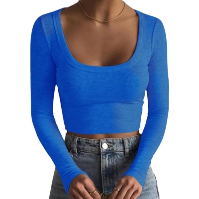 Women's Square Neck Long Sleeve Ribbed Slim Fitted Casual Basic Crop Top