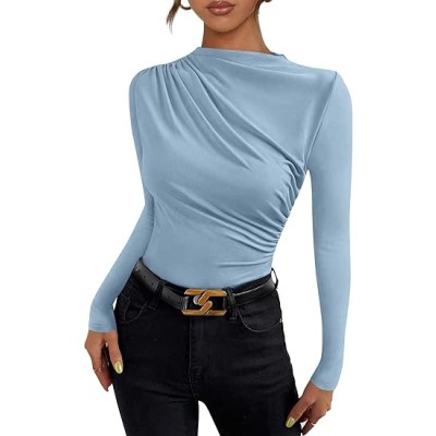 Womens Fall Crop Tops Long Sleeve Mock Neck Ruched Slim Fitted Basic Trendy Casual T Shirts Blouse